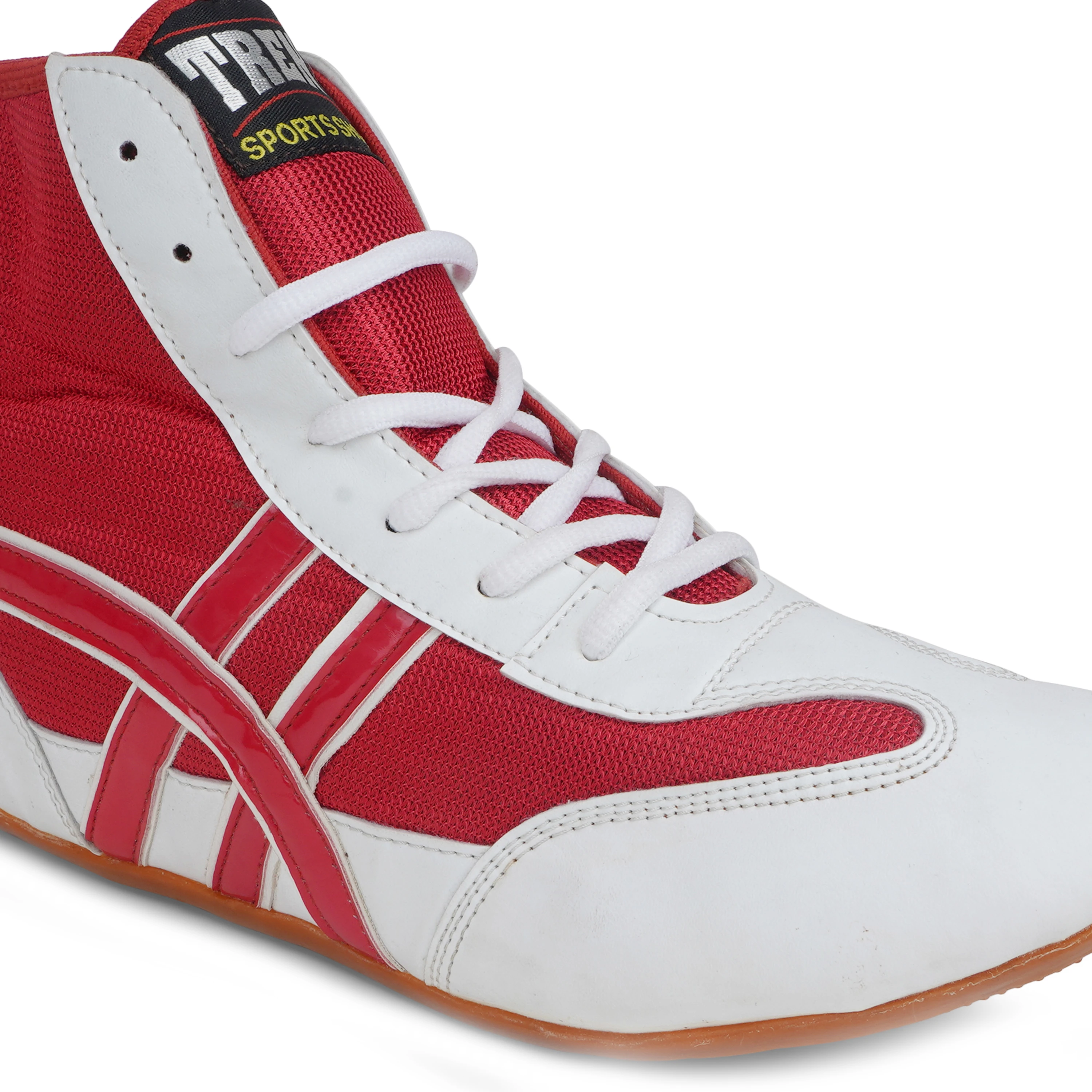 The Trenz High-Ankle Wrestling Shoes are designed for athletes who demand stability, grip, and comfort on the mat. Made with a breathable mesh upper combined with durable synthetic leather overlays, these shoes provide excellent ventilation while ensuring long-lasting performance. The high-ankle design offers enhanced support and protection during intense wrestling, boxing, and training sessions. A lightweight construction with a non-slip gum sole delivers superior traction, balance, and quick foot movement. Stylish in red and white, these shoes are ideal for both professional and training use.