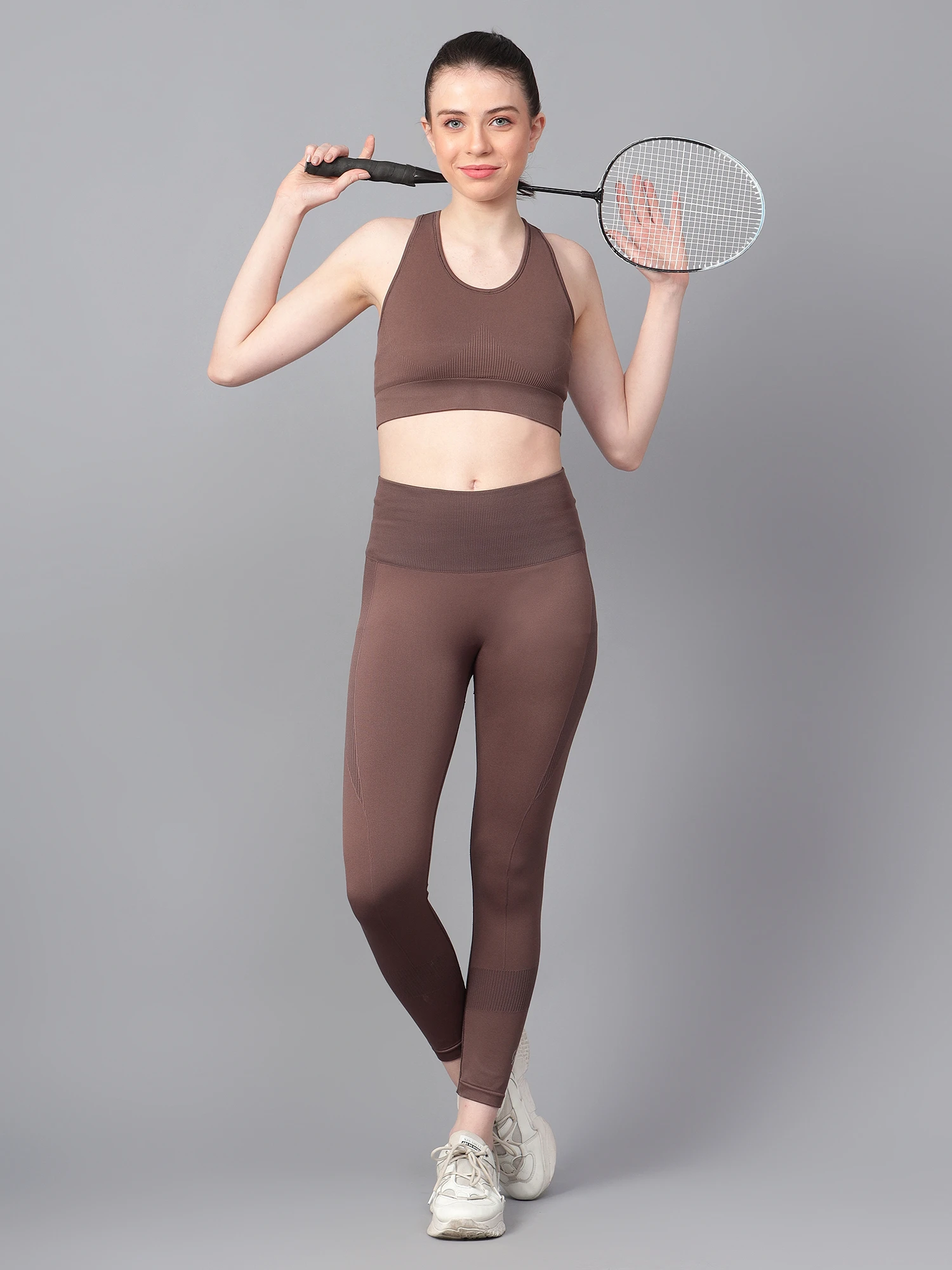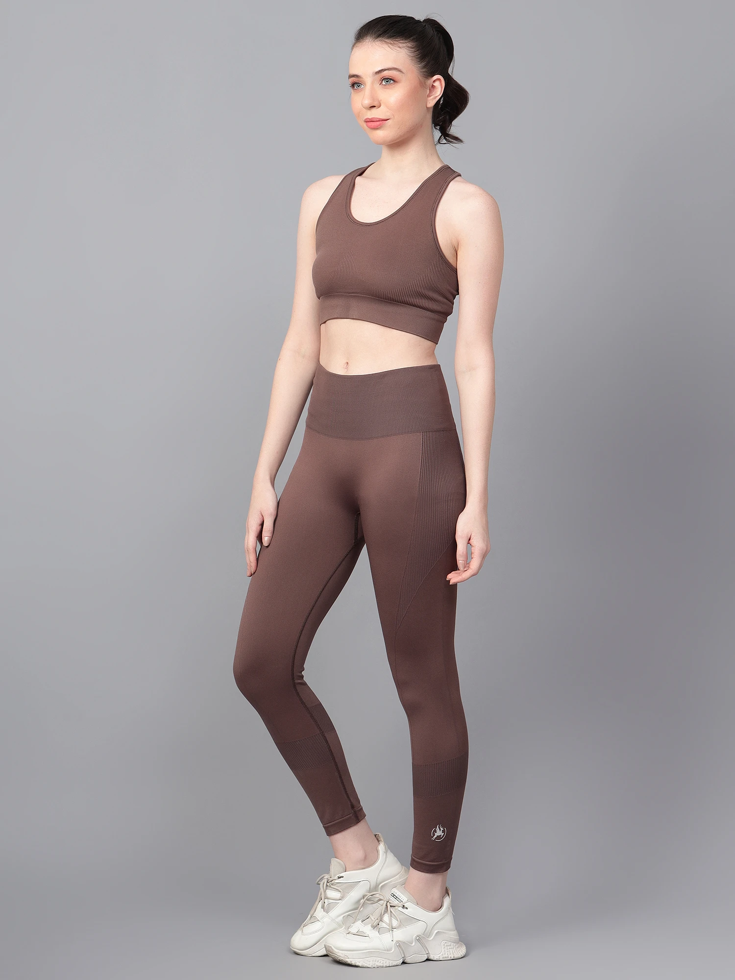 The matching high-rise leggings are made from premium nylon for a feather-soft feel and are tailored with a seamless, body-sculpting fit that hugs your contours and offers complete freedom of movement. The knitted waistband ensures a snug yet comfortable fit, while the moisture-wicking fabric keeps you dry and fresh all day.