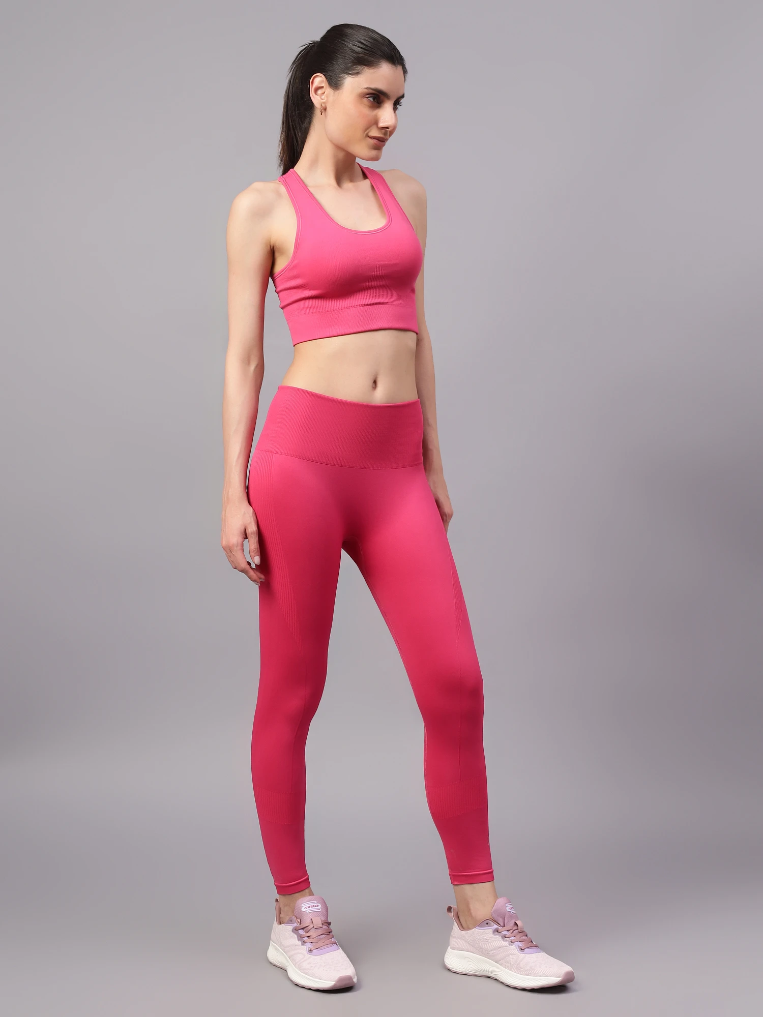 The matching high-rise leggings are made from premium nylon for a feather-soft feel and are tailored with a seamless, body-sculpting fit that hugs your contours and offers complete freedom of movement. The knitted waistband ensures a snug yet comfortable fit, while the moisture-wicking fabric keeps you dry and fresh all day.