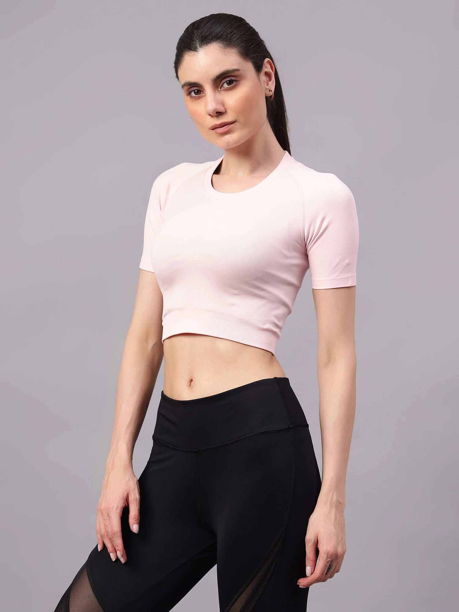 Elevate your style with this trendy, chic, and irresistibly cute crop-styled T-shirt. Engineered with seamless knit technology, it ensures a chafe-free and comfortably snug fit. The structured knit offers additional support and stretch for your active lifestyle.