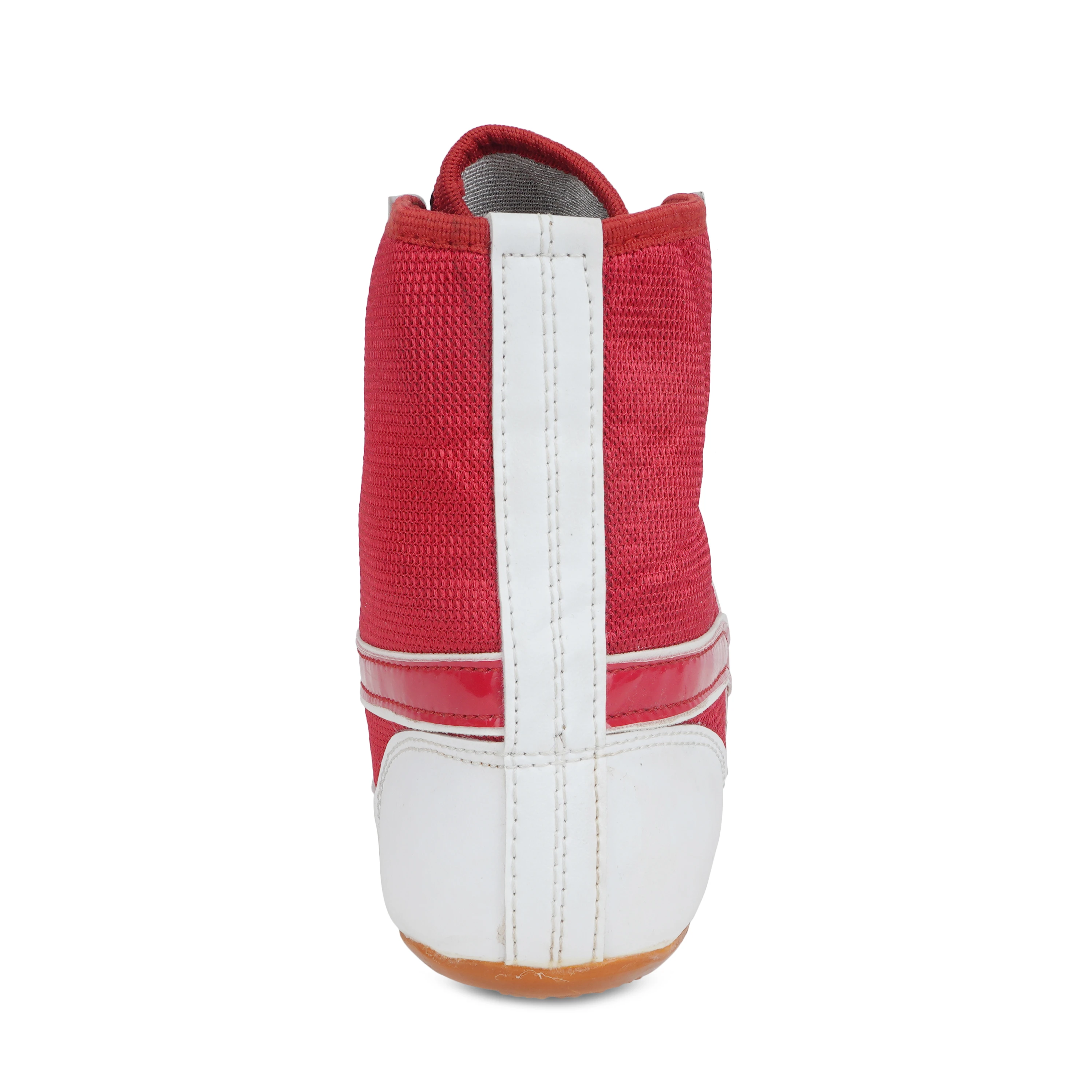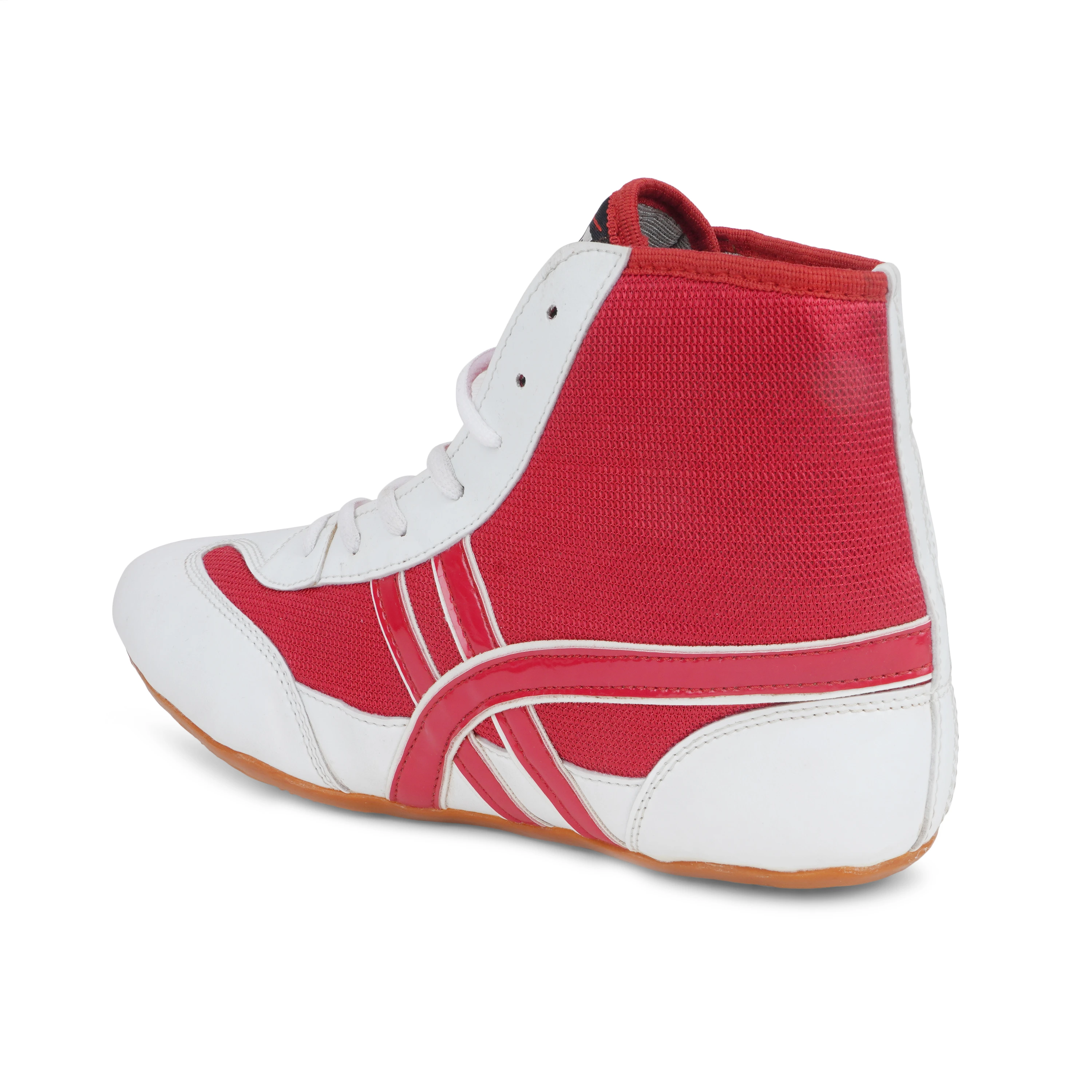 The Trenz High-Ankle Wrestling Shoes are designed for athletes who demand stability, grip, and comfort on the mat. Made with a breathable mesh upper combined with durable synthetic leather overlays, these shoes provide excellent ventilation while ensuring long-lasting performance. The high-ankle design offers enhanced support and protection during intense wrestling, boxing, and training sessions. A lightweight construction with a non-slip gum sole delivers superior traction, balance, and quick foot movement. Stylish in red and white, these shoes are ideal for both professional and training use.